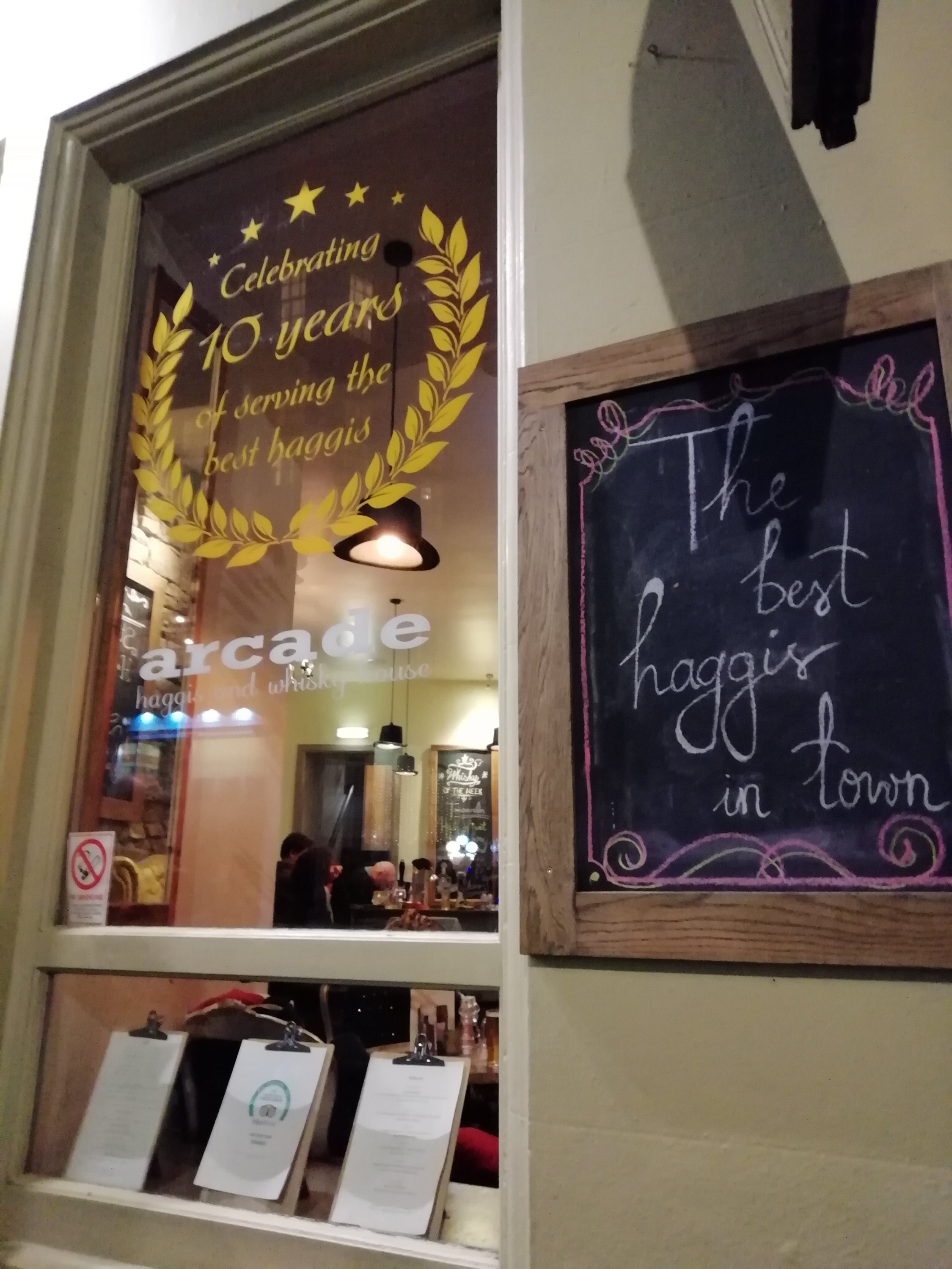 スコットランドの名物と言ったらハギスとスコッチウイスキーです。今回は日中でたまたま巡り会えた、arcade barと言うお店に入ってみました。