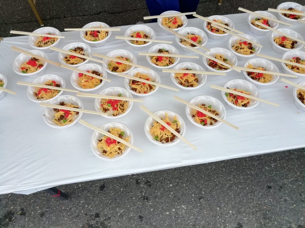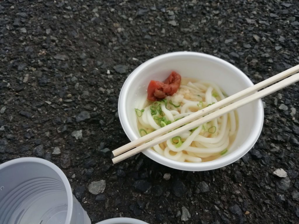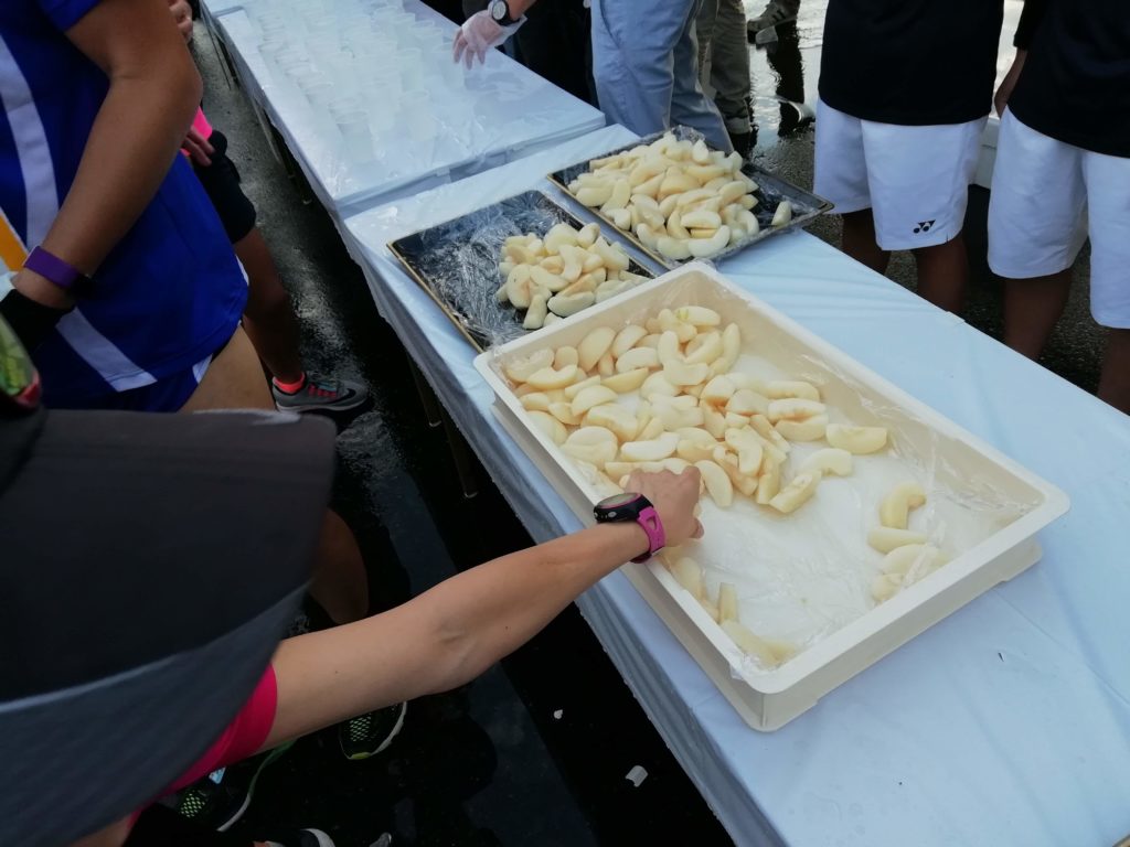 一般的なハーフマラソンやフルマラソンはエイドがあっても、スポーツドリンクや水の補給のみである場合がほとんどです。しかしウルトラマラソンのエイドでは、スポーツドリンク・水に加えてコーヒーやコーラ、大会によってはスペシャルドリンクが出されることもあります。さらには食べ物も充実していて、その地域の名産品や温かいおしるこ、うどんなどが出されます!京丹後の場合は、なしやちらし寿司が名産品として出されておりました。