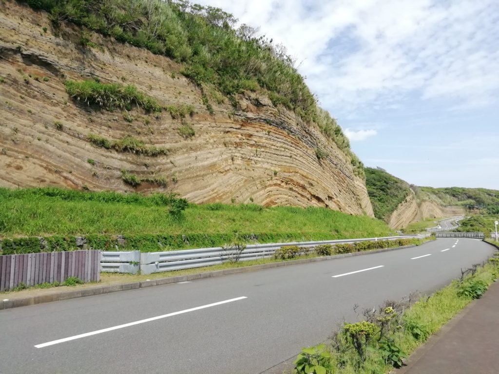 波浮港まで下りてくれば、今まで通ってきたような急こう配はありませんが、それでも走るにはきつい坂も出てきます。私が下りで何度も足がつり、走りのフォームも崩れてきたので、ロキソニンを投入しました。その後は木陰も出始めて、大きなアップダウンも少ないのでゴールまでつっきりました。大島ジオパークマラソンの最大の名所である、「大地層」も気持ちよく走ることができました。記録としては、6時間を切るペースで50kmの部を無事に完走できました!