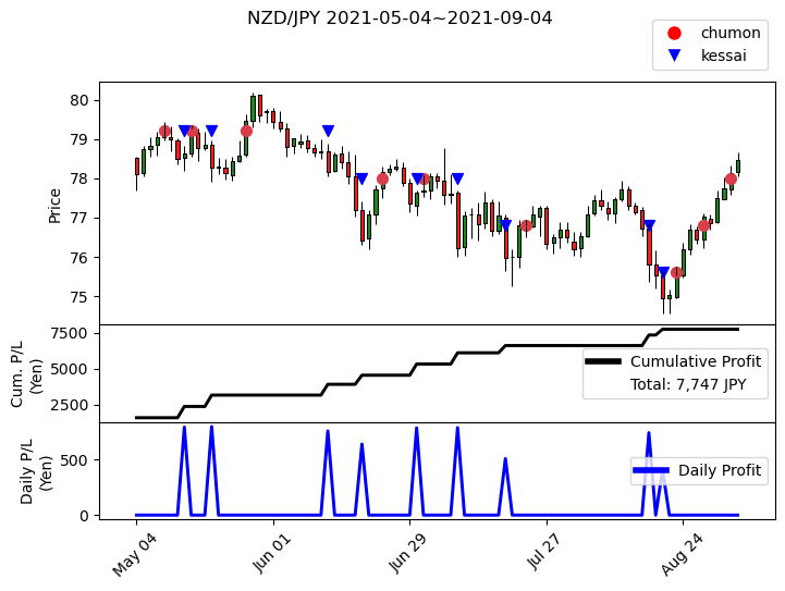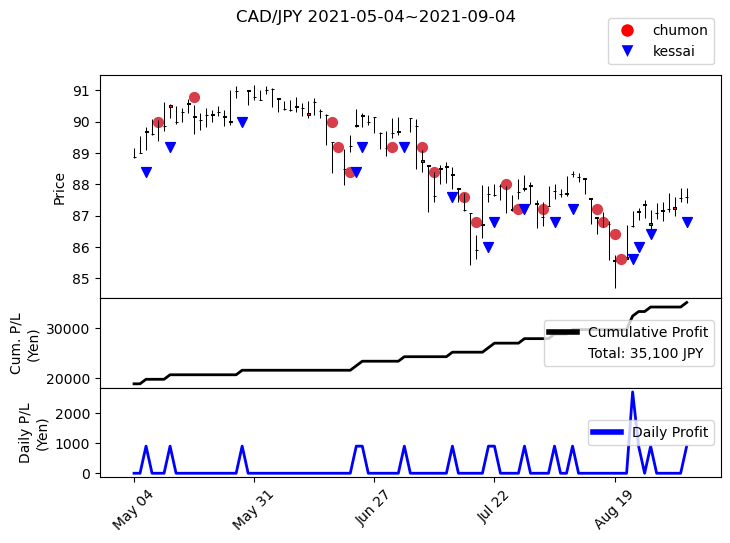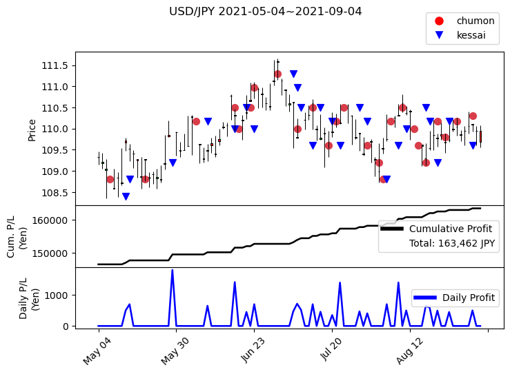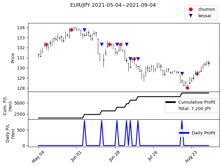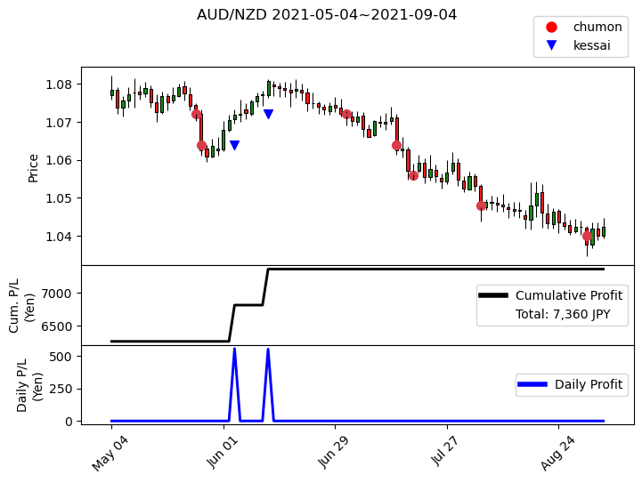 以下に通貨ペアの実績を示します。赤マルが新規注文を現し、青三角が決済注文を現します。真ん中に示しているのは、現時点までの累積の損益です。一番下には1日当たりの発生損益を示しております。
